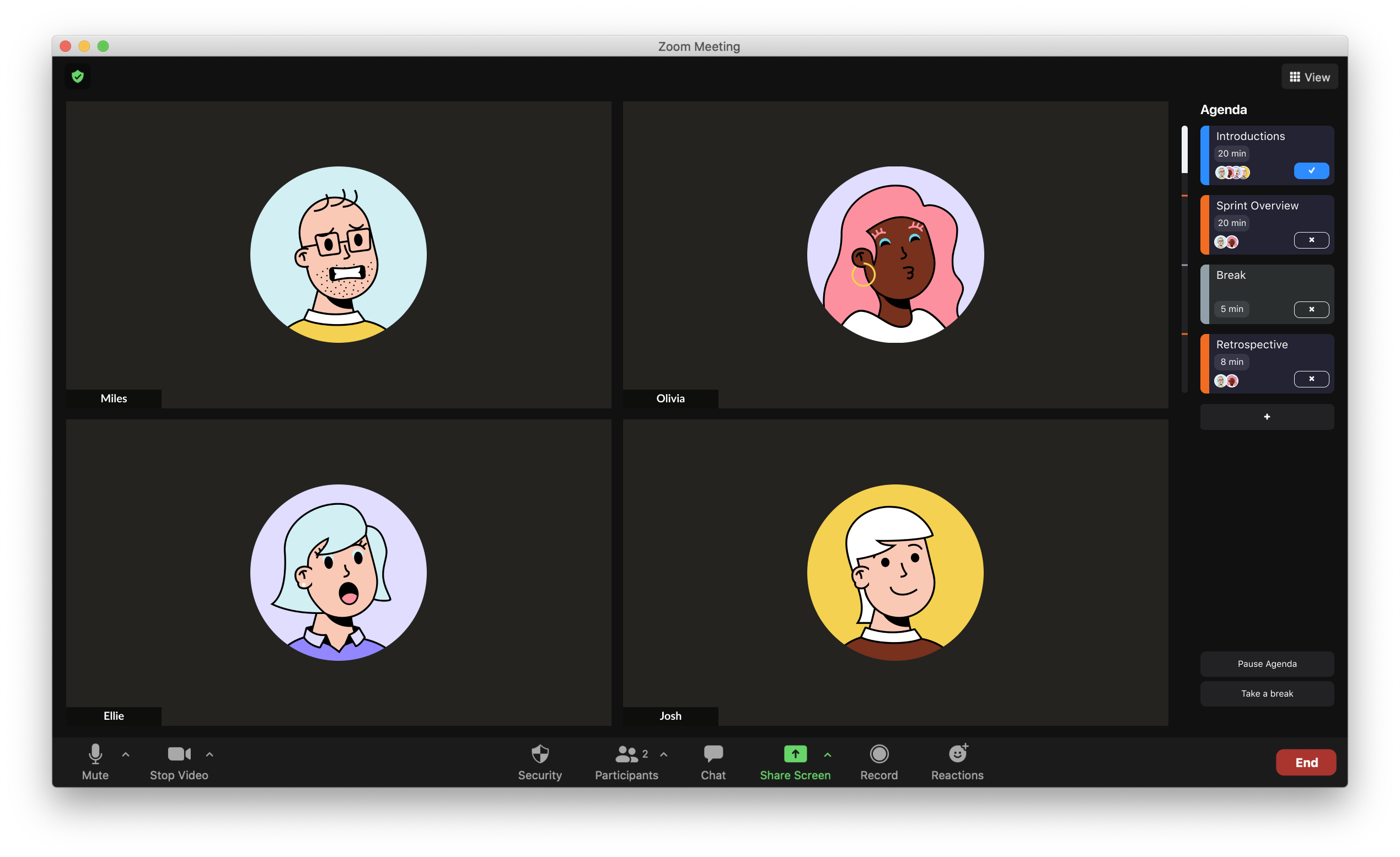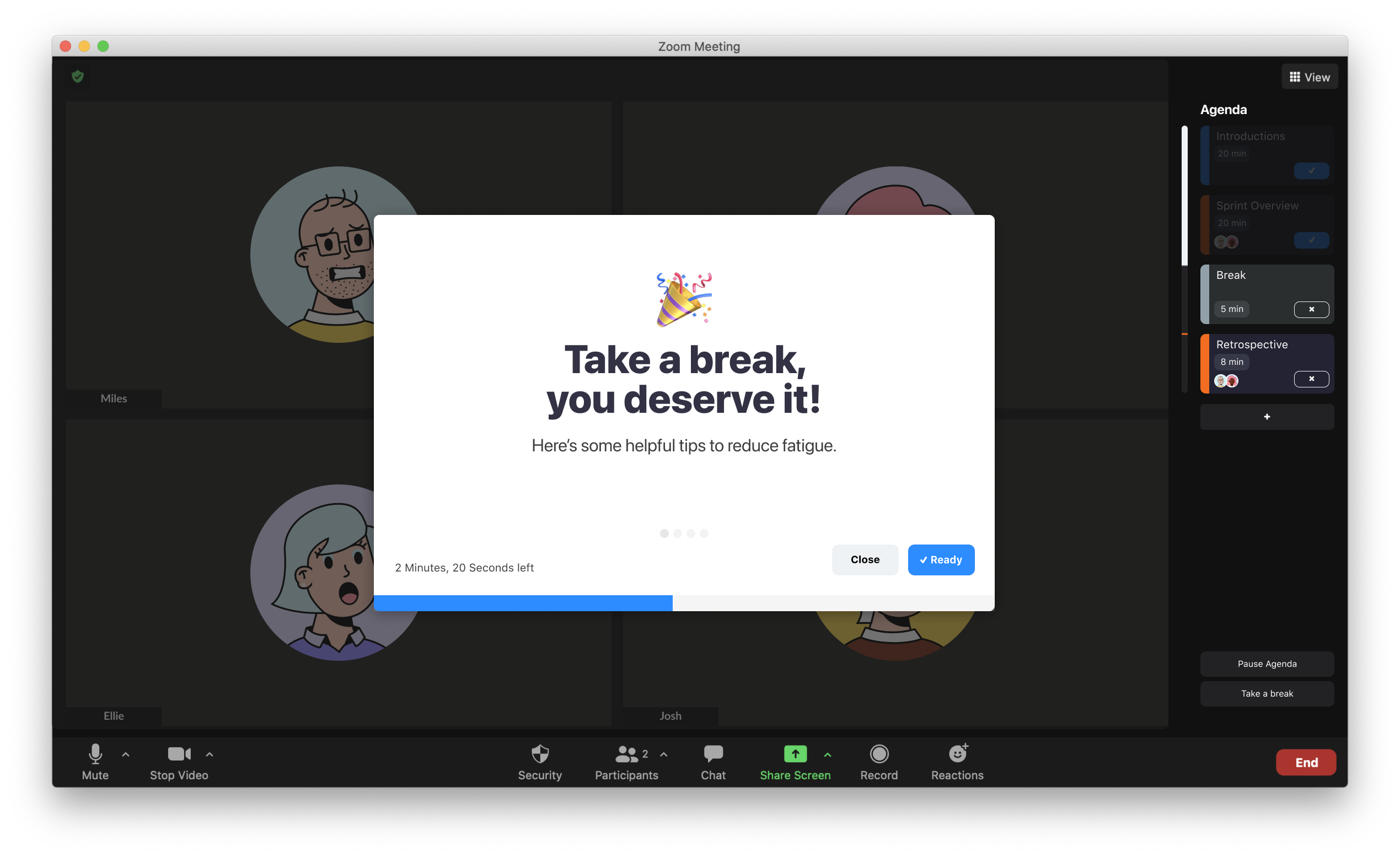 While in a call, the agenda and timer now appear within a tab on the right-hand side. This intuitively allows users to add or skip past agenda items and take a break when needed. During a set break, a series of scrollable messages of encouragement and helpful tips appear on the screen. Located down the bottom of the screen is an indication of time remaining, however, users can decide to signal they’re ready to resume the call with the ‘Ready’ button.
