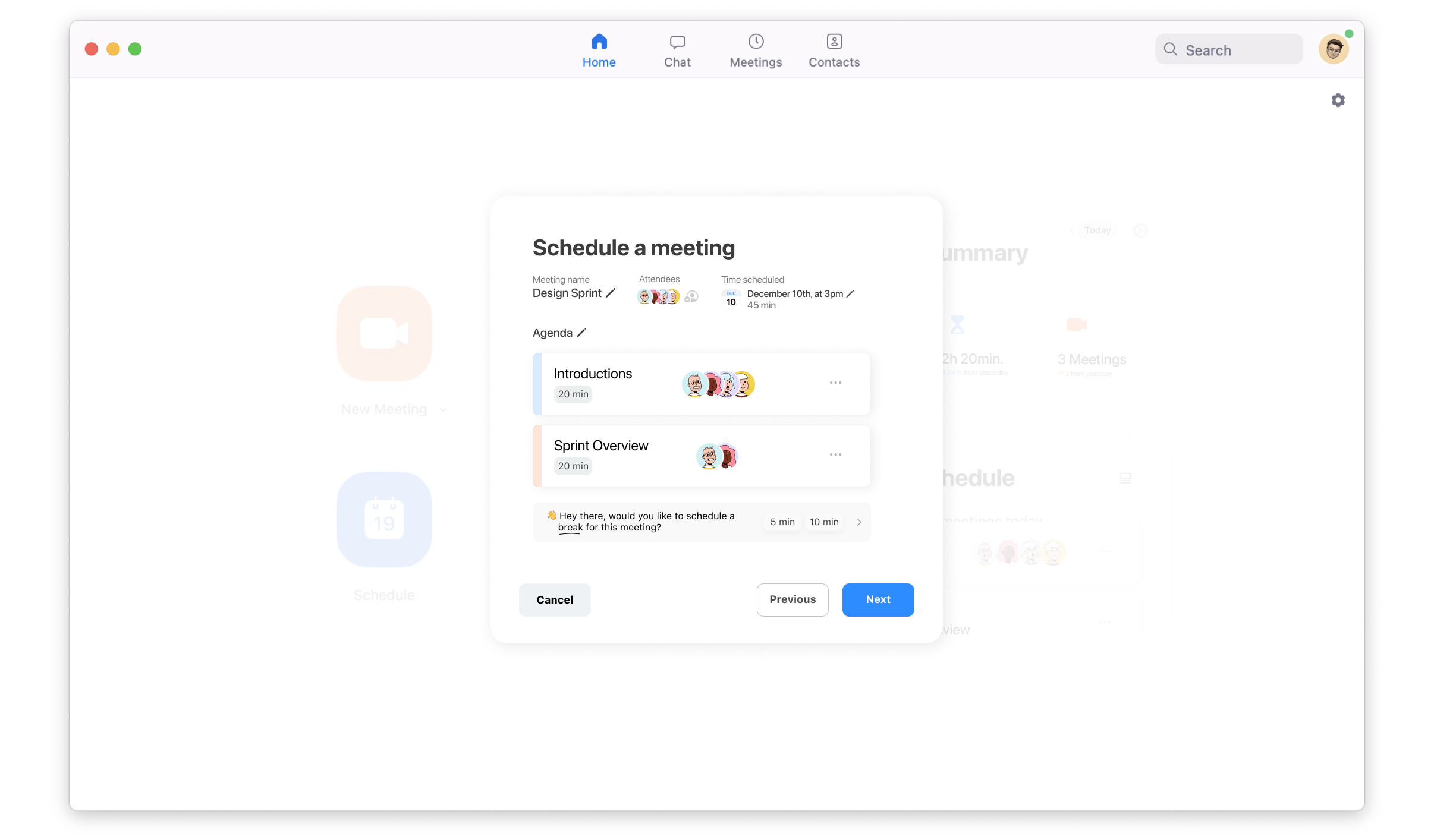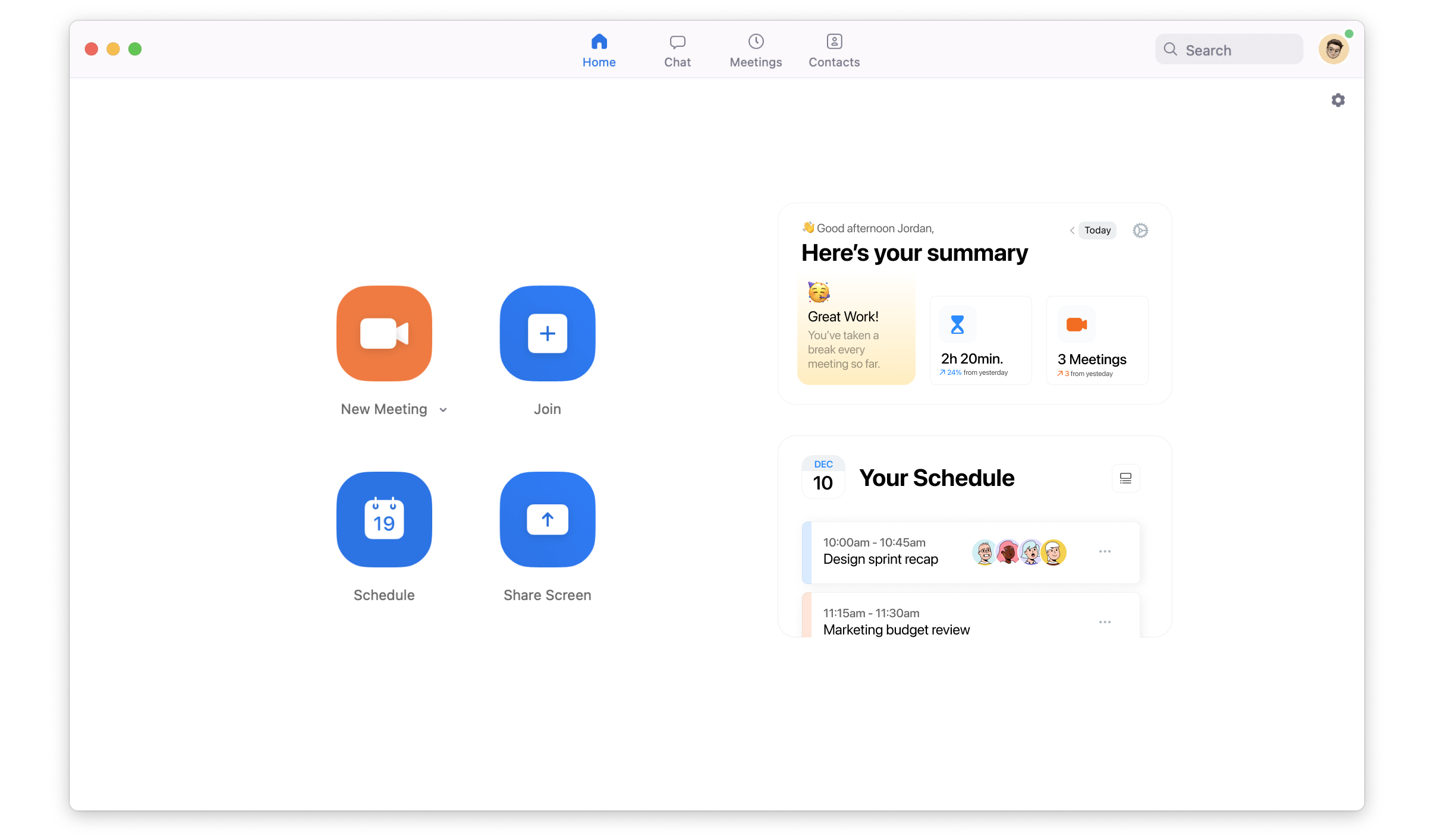 Essential to what I view the Zoom experience to be, is how simple and easy it is to jump right into the calling functionality. This design is intended to feel unobtrusive as possible to that flow, while introducing detailed information, such as screen time summary and the user's schedule. Here the user can view at a glance how much time they've spent within meetings and measure their time. In the case below, we can see Zoom feeding an encouraging message.