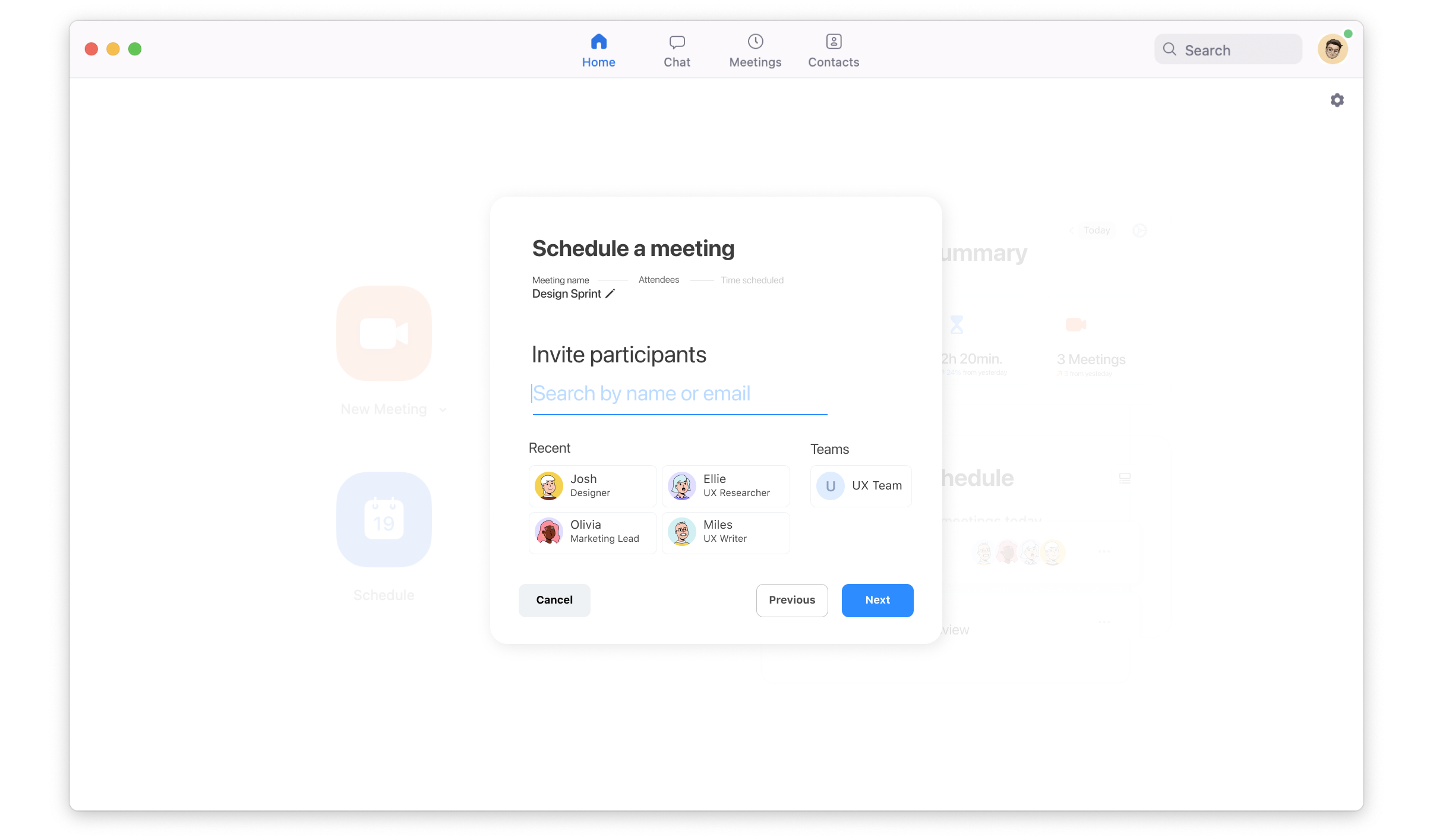 We can now invite participants before the call. To add a participant, simply type in the email address or select one from the list of ‘Recent’ names. You'll also notice as we progress, the breadcrumbs will form data from each step, allowing the user to edit and navigate through the pages easily.