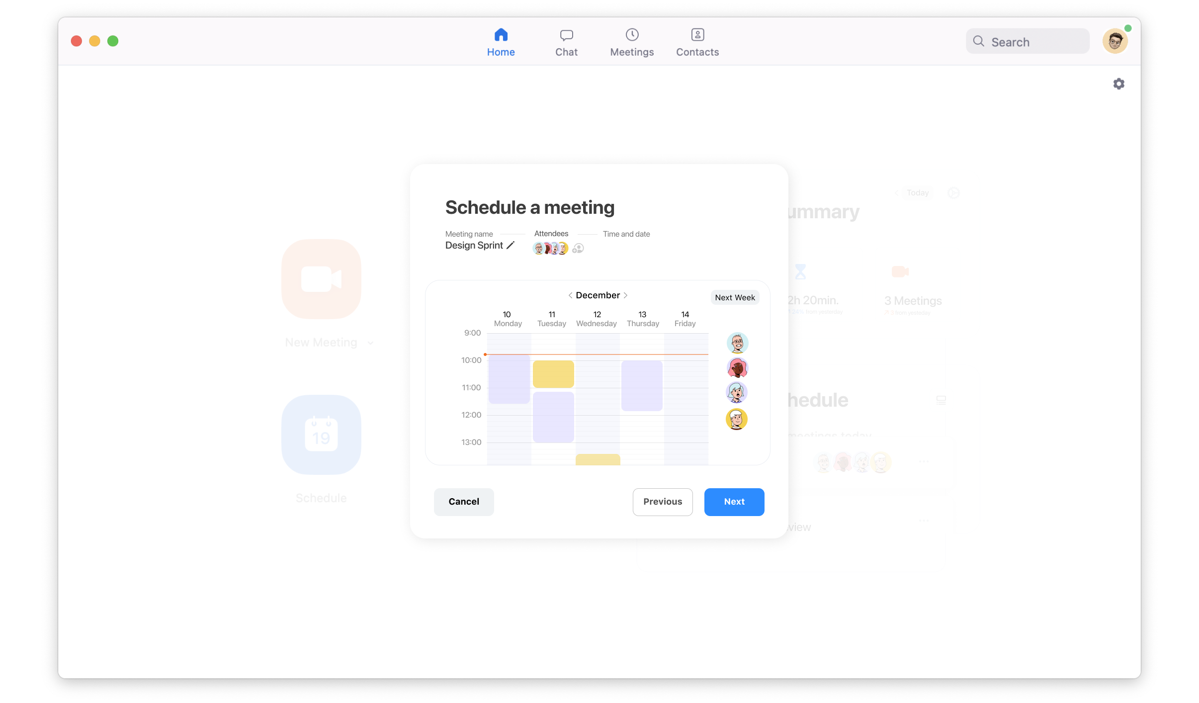 Scheduling a meeting is improved visually and made easier with an interactive calendar view the user can drag out whenever it suits. Below you can see the available and busy times of participants and the function to change months and weeks.