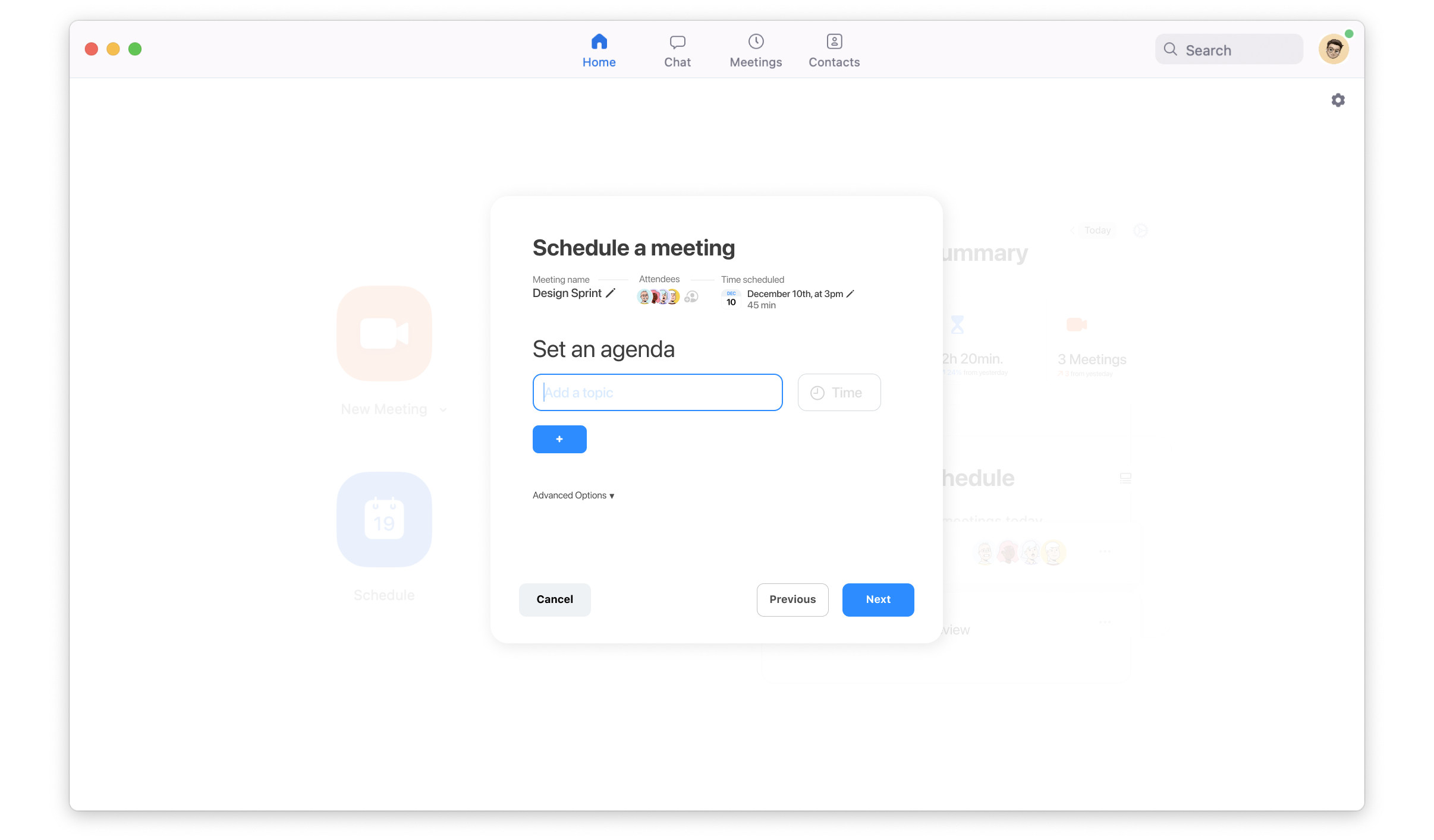 The ability to add Agendas and a set timer to meetings.