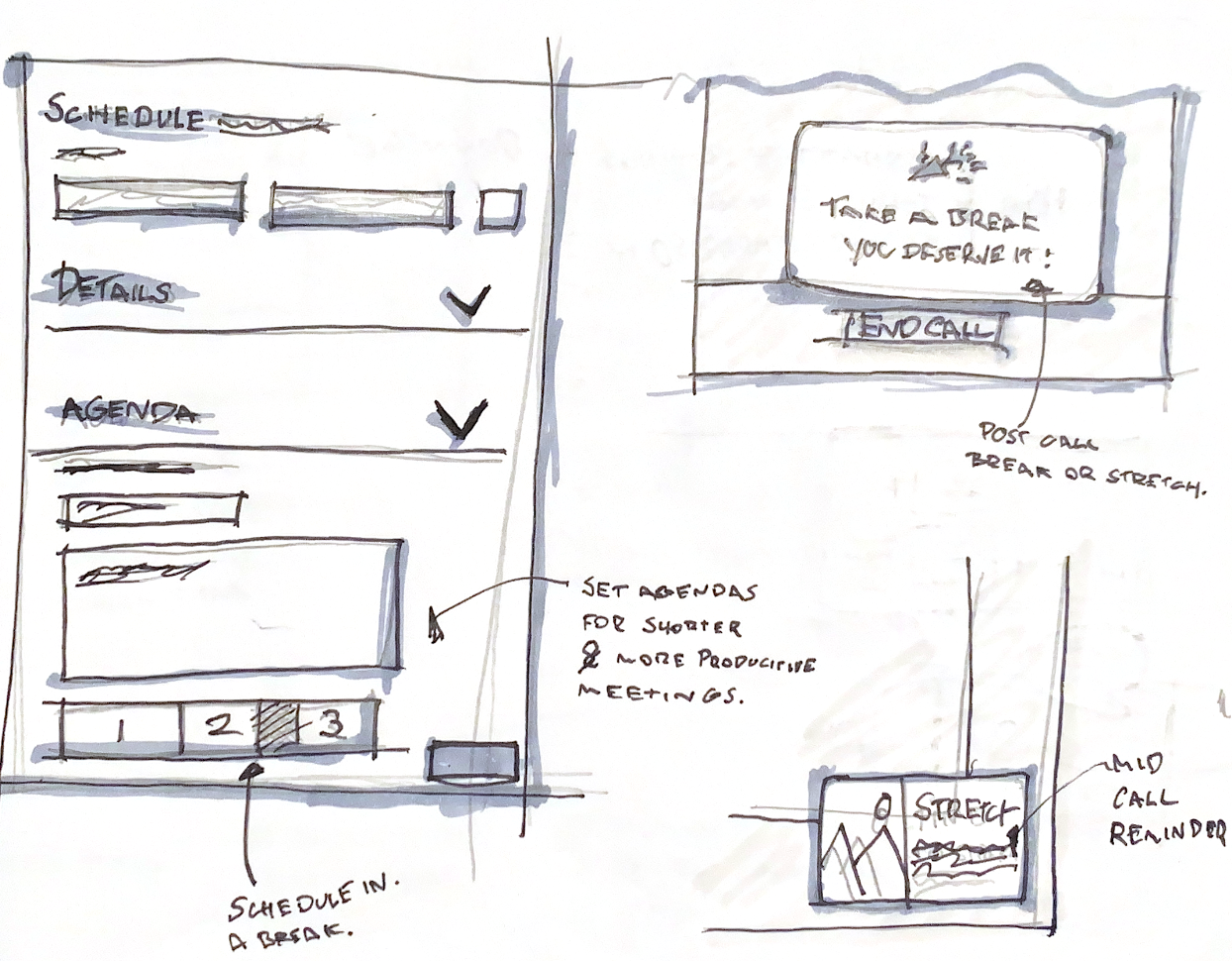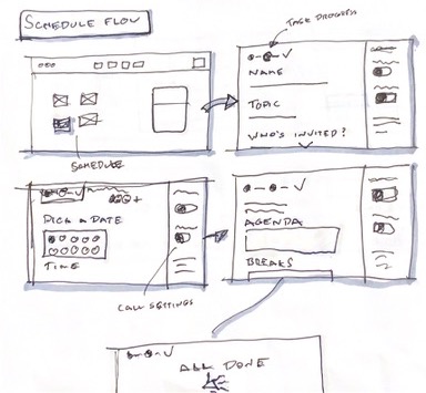 Entering into the design phase, I chose to focus on rapid-prototyping a revamped scheduling flow. Beginning with low-fidelity sketching is a great way to ideate quickly and focus on the bigger picture. Below, you can see some examples of how I progressed the scheduling tool's layout.